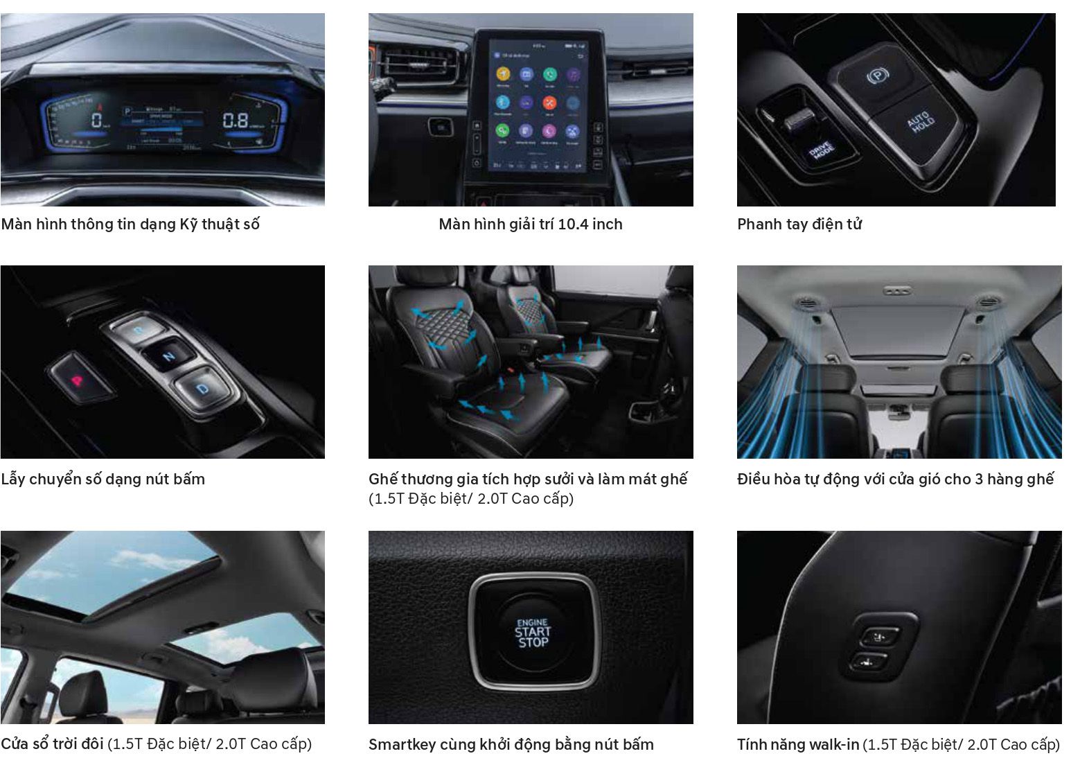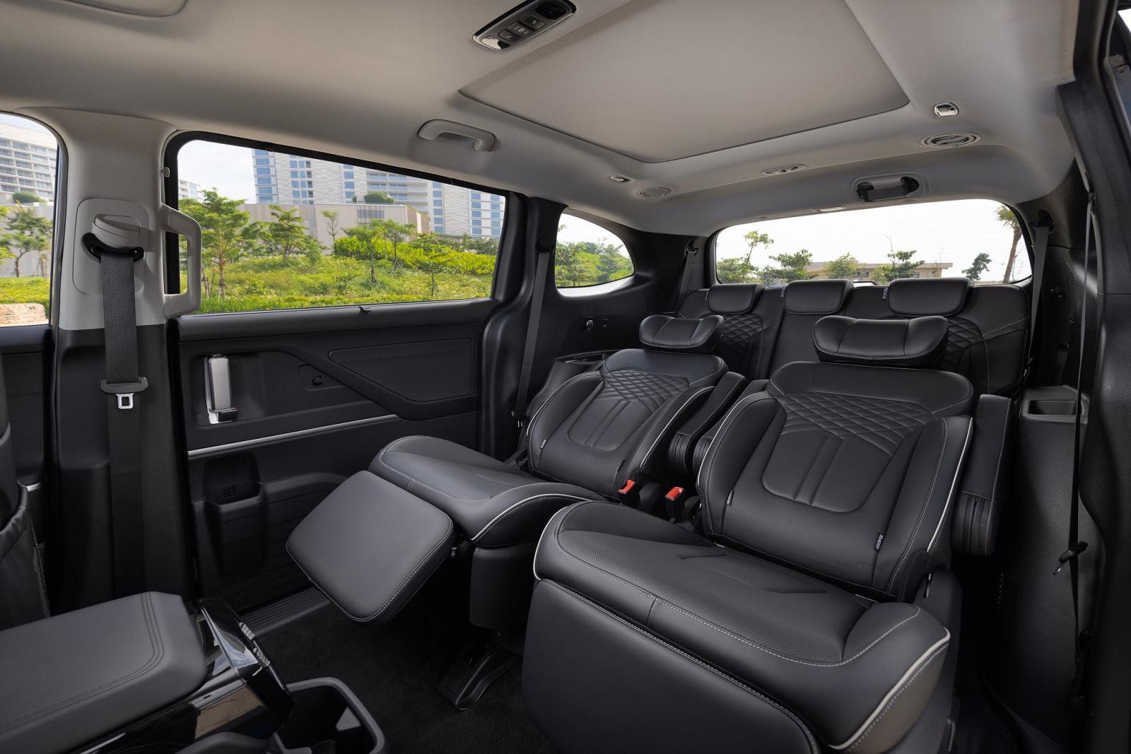 Cùng với đó là loạt trang bị đáng chý ý khác như chìa khóa thông minh, khởi động nút bấm kết hợp khởi động từ xa, phanh tay điện tử, camera toàn cảnh 360, cửa sổ trời kép, cốp mở điện, rèm chắn nắng cho hàng ghế sau, điều hòa tự động, cửa gió điều hòa và cổng sạc cho 3 hàng ghế...