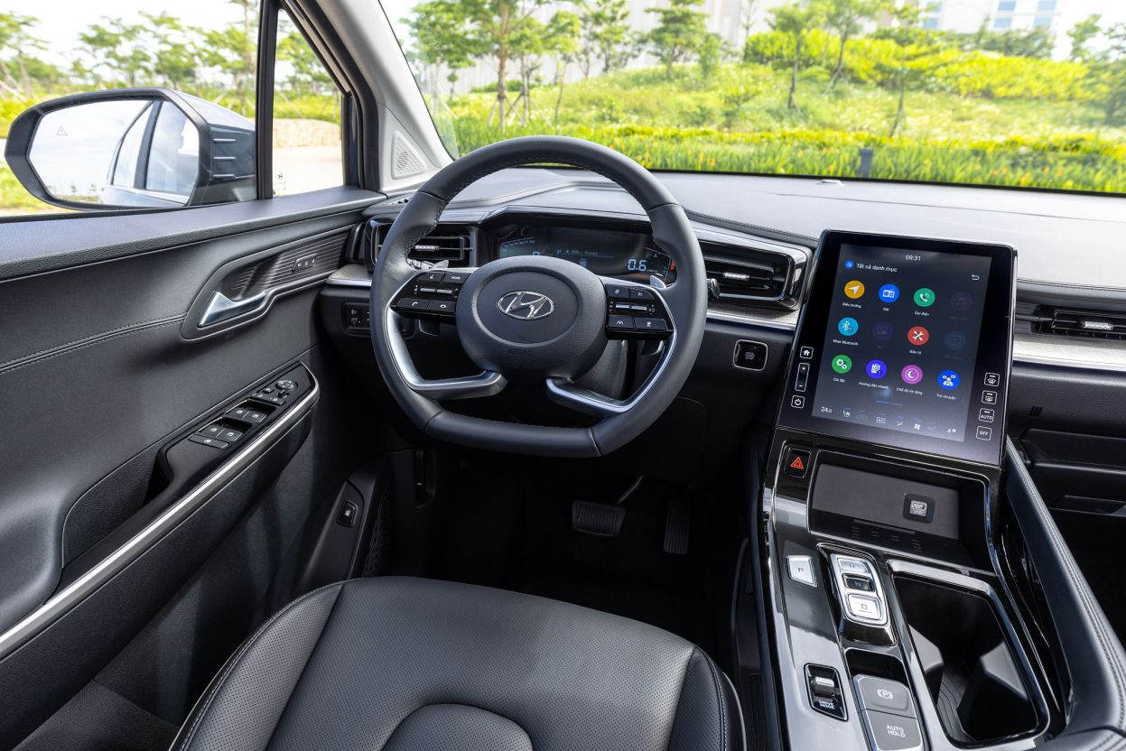 Vô-lăng quen thuộc tương tự Tucson, tích hợp lẫy số. Phía sau là bảng đồng hồ kỹ thuật số. Nút bấm chuyển số quen thuộc với ai đang sử dụng Santa Fe.