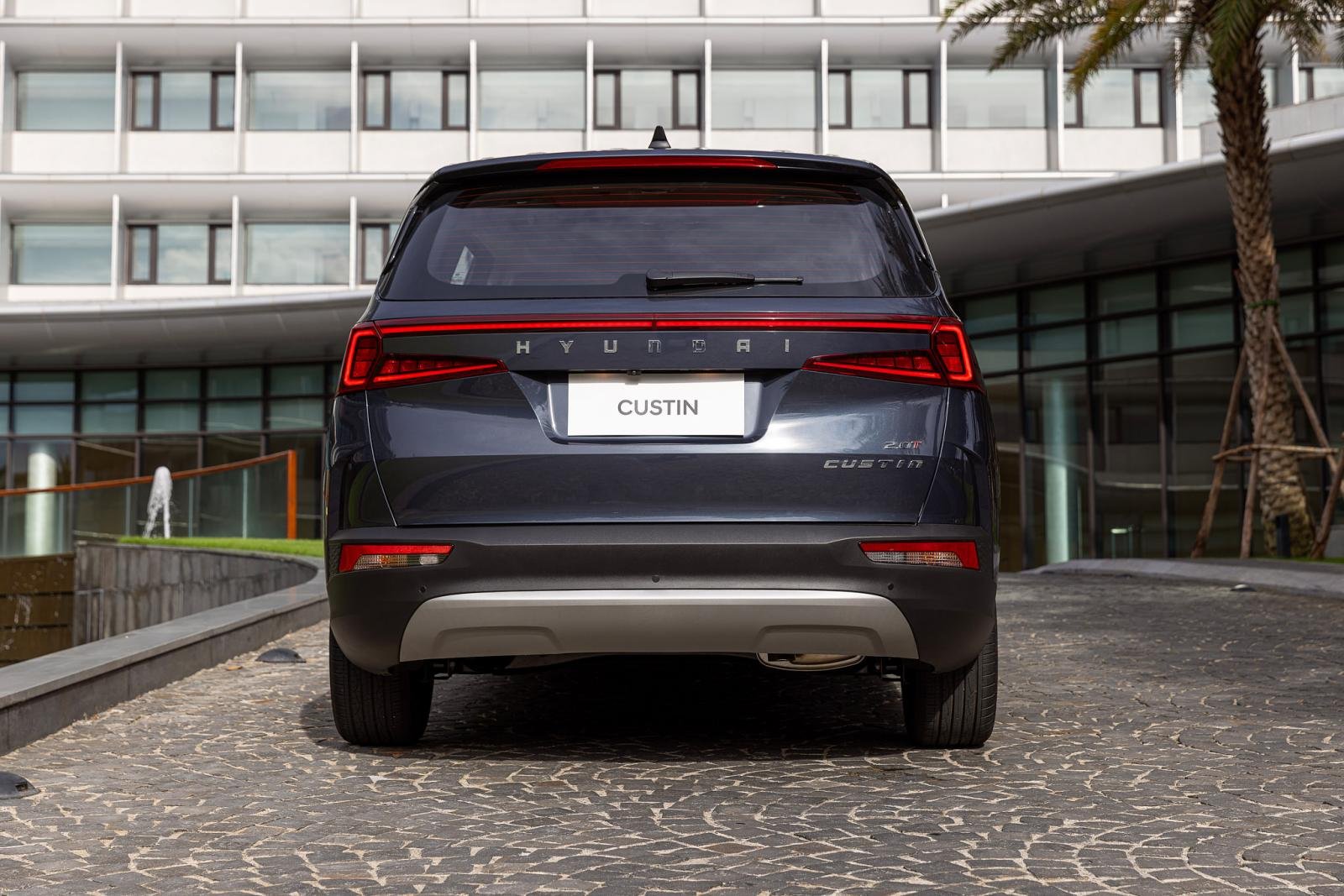Phía sau nổi bật với cặp đèn hậu LED được nối liền nhau thông qua dải LED vắt ngang cửa cốp xe. Custin không gắn logo hãng mà dùng dòng chữ HYUNDAI - cách xếp chữ giống Genesis.