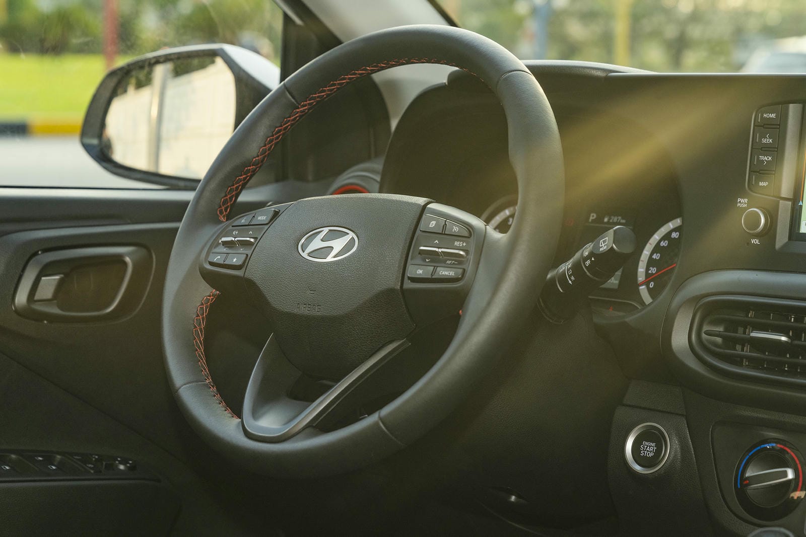 Vô lăng và cần số bọc da trên phiên bản 1.2 AT. Vô lăng xe có chức năng điều chỉnh 2 hướng tiện lợi. Phía sau là màn hình đa thông kích thước 2.8 inch, riêng bản 1.2AT được hãng ưu ái nâng kích thước lên thành 3.5 inch cung cấp đầy đủ các thông tin cho người lái một cách trực quan.