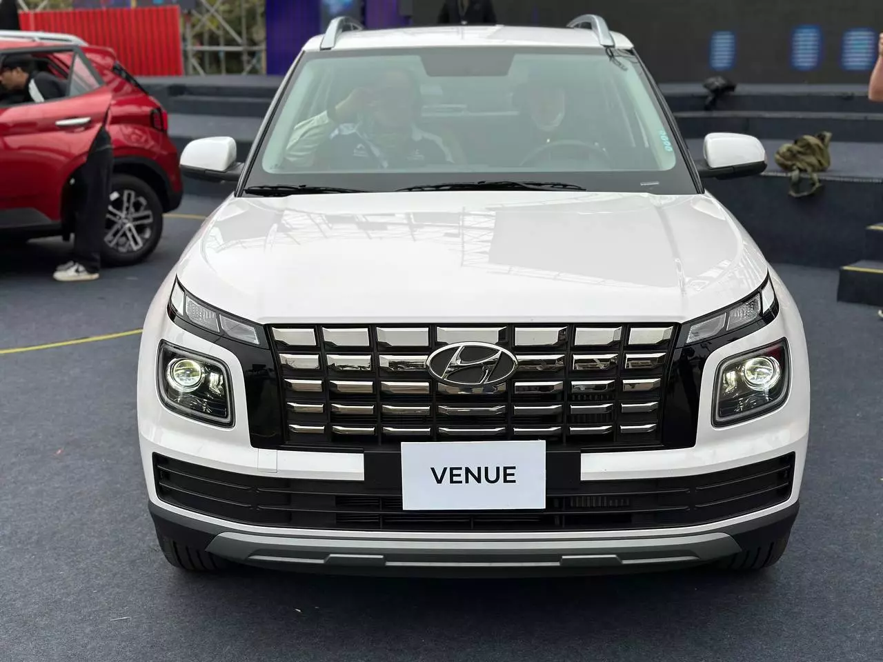 Ở phía trước đầu xe, Hyundai Venue có lưới tản nhiệt hình chữ nhật với kích thước lớn hơn và họa tiết tương tự với mẫu xe Hyundai Palisade. Viền của lưới tản nhiệt được sơn màu Dark Chrome, tạo nên vẻ sang trọng và độc đáo. Cụm đèn chiếu sáng được thiết kế tách biệt, bao gồm đèn pha đặt ở phía thấp và đèn ban ngày thanh mảnh, được nối liền một cách hài hòa với lưới tản nhiệt.